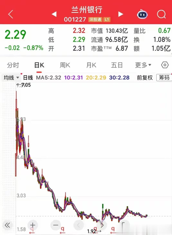 兰州银行刻下股价2.29元,市盈率6.97倍,估值处于行业低位。2025年以来,该股从2.67元回落至刻下价位,年内跌幅16%,短期转折幅度不算凸起。若拉永劫间周期,该股从三年前7.05元的高点回落于今,累计跌幅达到68%,弥远下行趋势昭彰。
