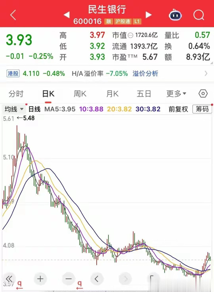 民生银行属于宇宙性股份制银行,这一轮银行股举座高潮流程中,该股并未创出阶段新高,属于高潮幅度有限、转折幅度偏大的品种。2025年7月该股波及短期高点5.48元,随后不绝回落,最新股价跌至3.93元,区间跌幅达到36.5%,转折幅度在股份行中位居前哨。