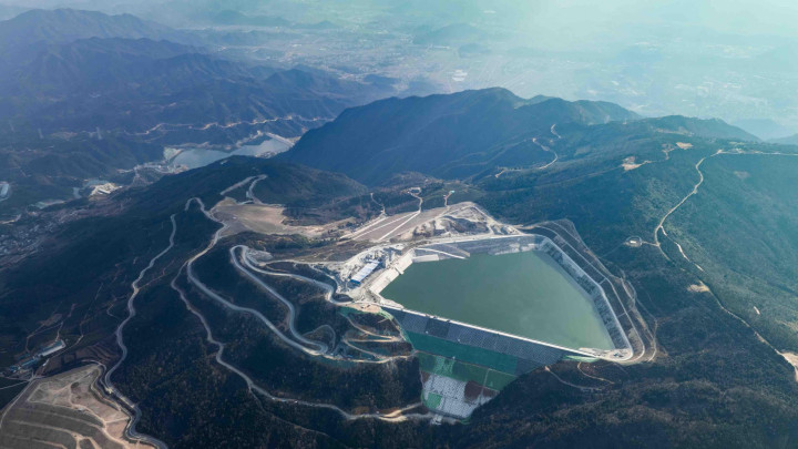 前不久,浙江天台抽水蓄能电站(以下简称“天台抽蓄电站”)首台机组负责并网发电,为我国华东电网添加了一座巨型“充电宝”:山顶上水库内水流奔涌而下,借助724米超高水头,驱动水轮机组延绵连续发出绿电;山眼下水库掀开胸怀选定来水,待水量充盈、电量肥沃时,再将水送至上水库储存起来,完成蓄能。