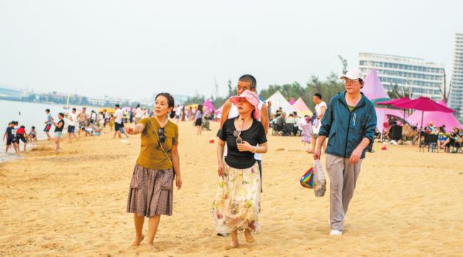 4月6日,海口荣山寮村东说念主头攒动,旅客在沙滩上不雅光。记者 石中华 摄