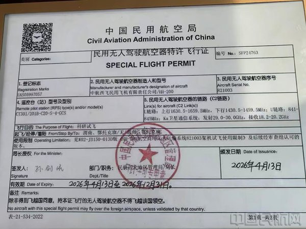 新舟鸿鹄HH-200航空商用无东说念主运载系统首飞准备使命一切就绪后,民航西北地区惩办局向中航西飞民用飞机有限公司颁发了民用无东说念主驾驶航空器特准飞行证。