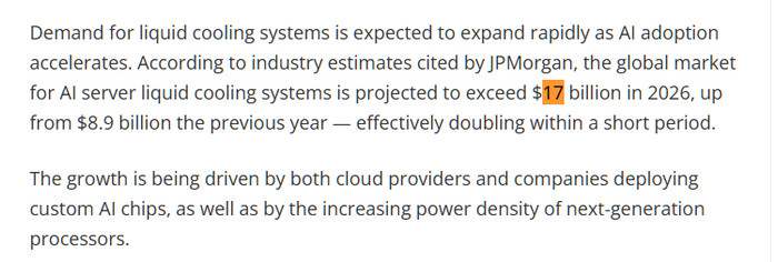 业内多量觉得,液冷系统已从此前的“可选树立”,跃升为东谈主形机器东谈主贸易化落地的“必选标配”。任海东先容,液冷散热将成为高端性能机器东谈主的居品标配,不仅能措置高功率高动态下的散热贫窭,更能普及机器东谈主可握续功课才调与部件寿命,是复古其工业化高强度功课的重要技艺。摩根大通2026年3月发布的评释清晰,2026年全球AI做事器液冷系统商场展望将从上年的89亿好意思元跃升至170亿好意思元以上,同比增幅达九成。