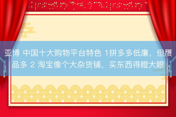 亚博 中国十大购物平台特色 1拼多多低廉,但赝品多 2 淘宝像个大杂货铺,买东西得瞪大眼