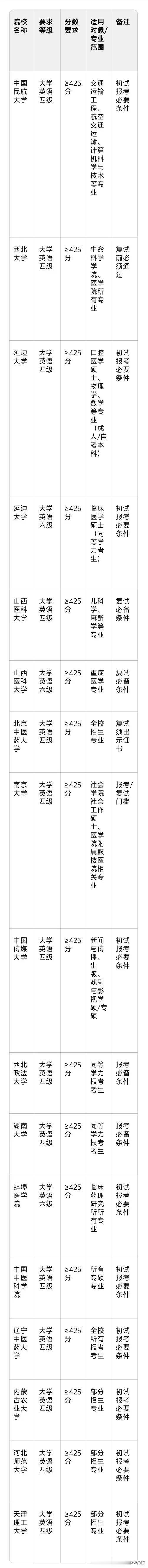 比如中国民航大学、山西医科大学、西北大学的部分专科,报考时就明确条款四级或六级达到425分。没过?抱歉,报不了。