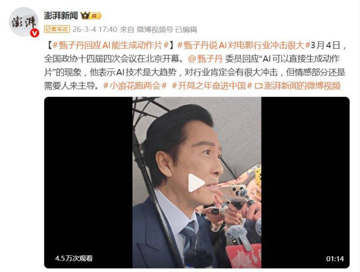 据3月4日报谈,62岁的功夫巨星甄子丹以天下政协委员身份亮相2026年天下两会,现场顿然被媒体和粉丝“围堵”。一句幽默的“我可能打不外它们”,不仅化解了对于AI挑战的尖锐发问,更偶然成为本年两会一个粗陋又科技感完全的热门。