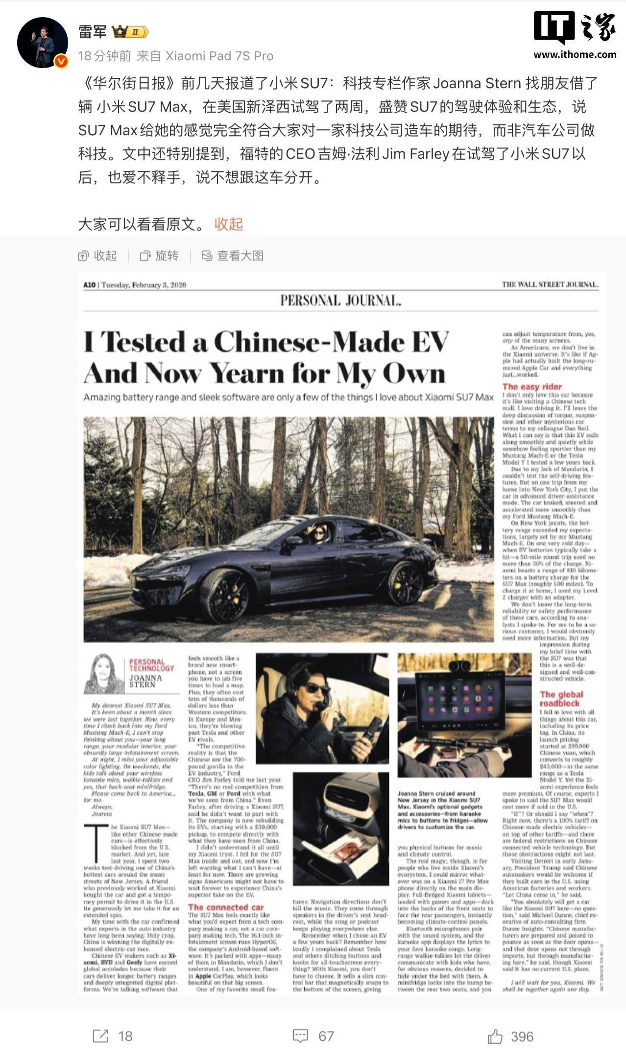 小米SU7近期在国际汽车圈激发无为暖热。据《华尔街日报》报谈,科技专栏作者乔安娜·斯特恩通过一又友借到一辆小米SU7 Max,在好意思国新泽西进行了为期两周的深度试驾。她在体验后盛赞这款车型的驾驶感受与智能生态系统,觉得其完满契合科技公司跨界造车的蜕变定位,与传统汽车厂商的科技专揽造成显然对比。